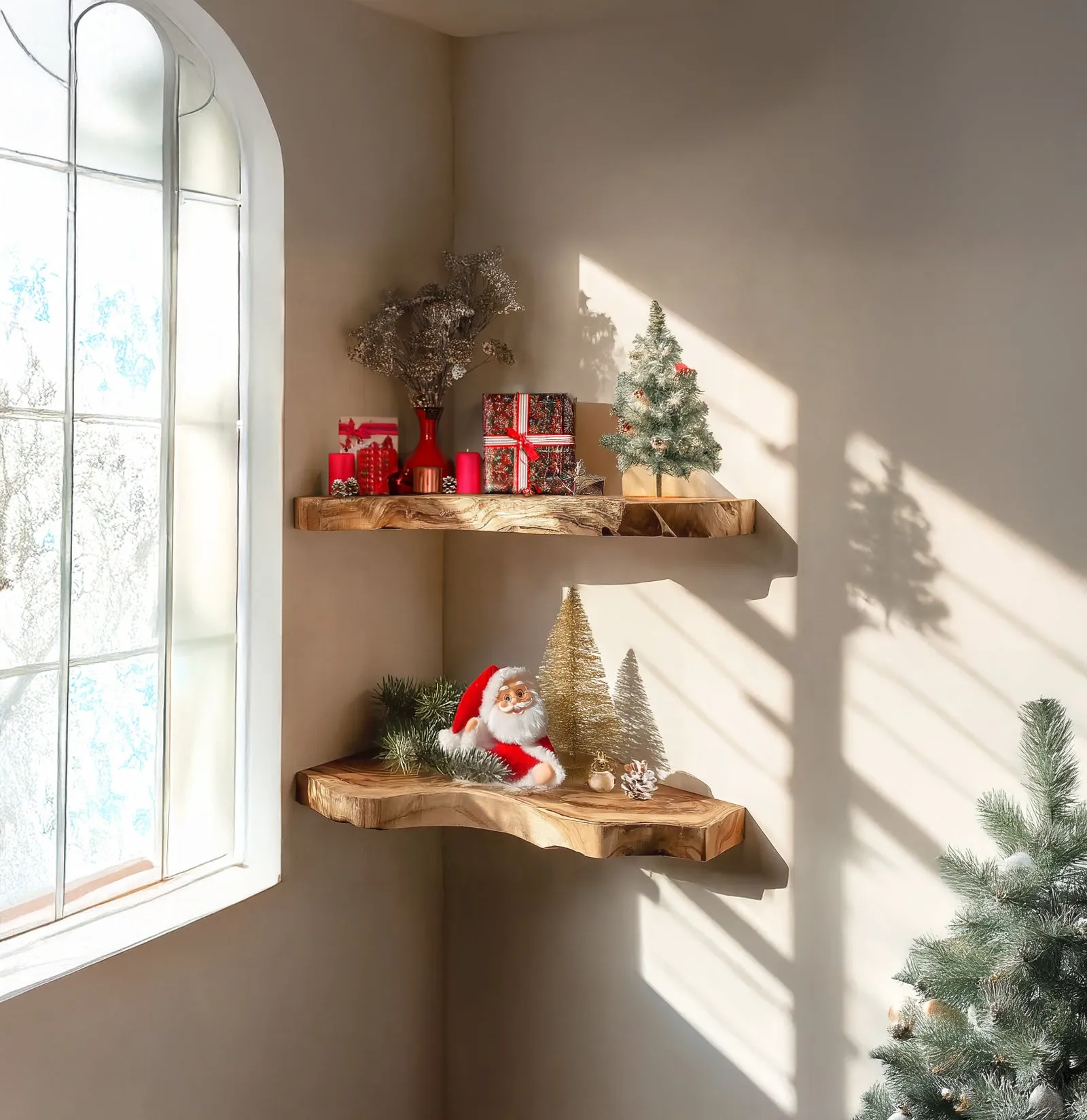 Elevate a blank stretch of wall with a handmade live edge floating shelf crafted from solid wood. The slim plank showcases an expressive grain and a gently undulating front edge, bringing a sense of movement to otherwise flat planes. Mounted as a single ledge or grouped in a staggered trio, the shelf becomes an easy backdrop for paperbacks, framed photos, and seasonal ornaments, making it a fitting holiday gift for anyone who enjoys refreshing a space without heavy furniture.