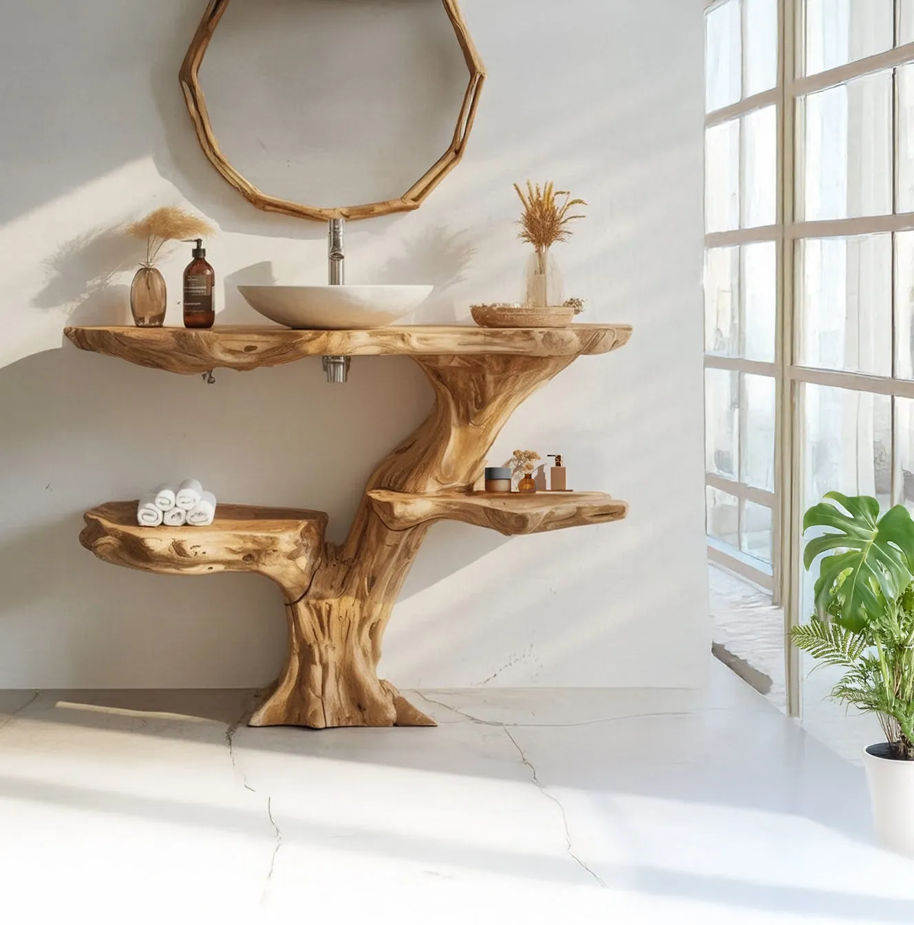 Reclaimed construction offers both durability and story. The timber is selected for strength and finished by hand to protect against everyday splashes. Color and grain vary from piece to piece, and the live edge ensures that no two vanities present exactly the same outline. Paired with matte black or brushed brass fittings, the vanity shifts from rustic modern to warm contemporary with ease, coordinating with white, stone, or deep painted walls.
